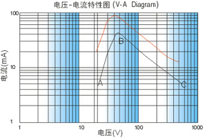 PTC电压电流曲线特性图 电压-电流特性亦称伏安特性,是指室温下的静止的空气中式样两端的电压与其稳态电流之间的关系。从图中可知,曲线由AB、BC二段构成:AB段电阻基本不变,元件自热温升不高。BC处于开关温度附近。把PTC热敏电阻与负载串连,恰当选择电阻阻值及工作状态,可起到电流保护作用于发热的PTC元件。在一定电压和标准环境下,测量到的稳定温度称为PTC 表面温度(Ts)。使用时,PTC在以表面温度为中心的一个极小温度范围内,功率-环境达到动态平衡,实现自动控制温度。根据不同用途的需要,调整工艺和配方,可以制造出不同电阻范围,不同表面温度的PTC元件。